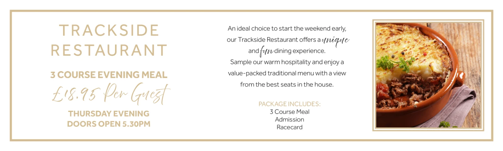 Experience our warm hospitality and fantastic value dining package at only £18.95 for a delicious 3 course meal, entry and racecard.